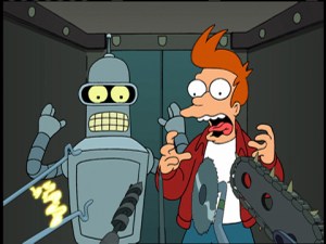 Fry finds himself in the year 3000, in an unfamiliar New York City. The future has many of the things you would expect—robots, space travel, and flying cars—and many you wouldn’t. It’s got celebrity heads in jars and suicide booths. One of the funniest and weirdest scenes ever takes place when Fry meets the wisecracking robot Bender. “Well, I don’t have anything else planned for today,” Bender declares, “Let’s go get drunk!”