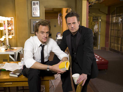 Seventeen minutes in, we first hear the names Matt Albie and Danny Tripp. We know there’s history, potential controversy. At minute 19, after the second commercial break, we finally meet them: Matt, played by Matthew Perry and Danny, played by Bradley Whitford, recently off of the success of The West Wing. They are immediately fascinating characters with huge back story; for starters we learn that Matt and his longtime girlfriend, Studio 60 actress Harriett Hayes recently broke up because of the Star-Spangled Banner.